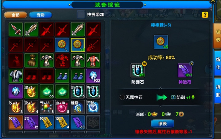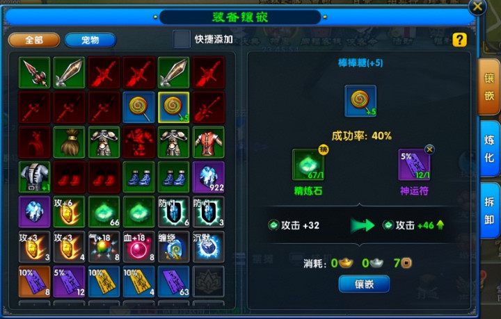 如果说精炼是“固定加餐”,那装备镶嵌就是“私人定制”。镶嵌属性石无需遵循固定规则,你可以根据自身职业需求自由选择——输出职业可镶攻击石、暴击石,坦克职业可嵌防御石、闪避石,辅助职业则适合真气石、治疗石。不过要记住,一件装备一旦镶嵌某类属性石,后续就只能镶嵌同类型的,选择时可要深思熟虑。
